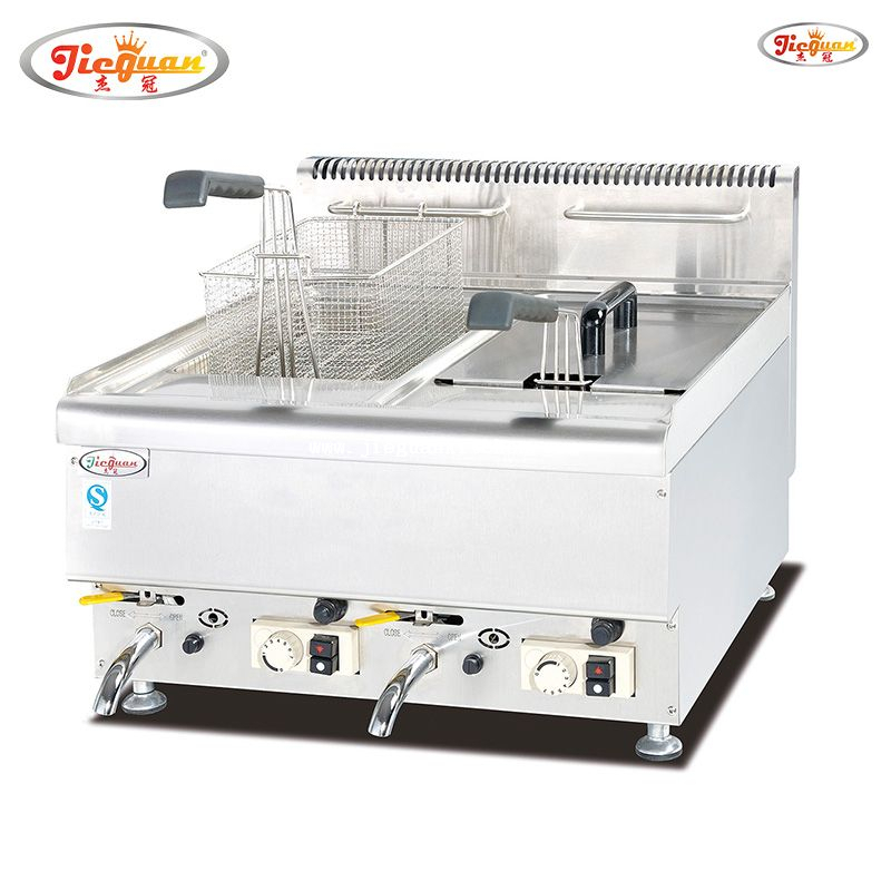 Una freidora de gas de 2 tanques con una capacidad de 14 litros (L) es un aparato de cocina comercial diseñado para freír alimentos. Normalmente, cada tanque tendría una capacidad de 7 litros, lo que lo hace adecuado para restaurantes, cafeterías y otros establecimientos de servicio de alimentos que necesitan preparar una variedad de alimentos fritos de manera eficiente.